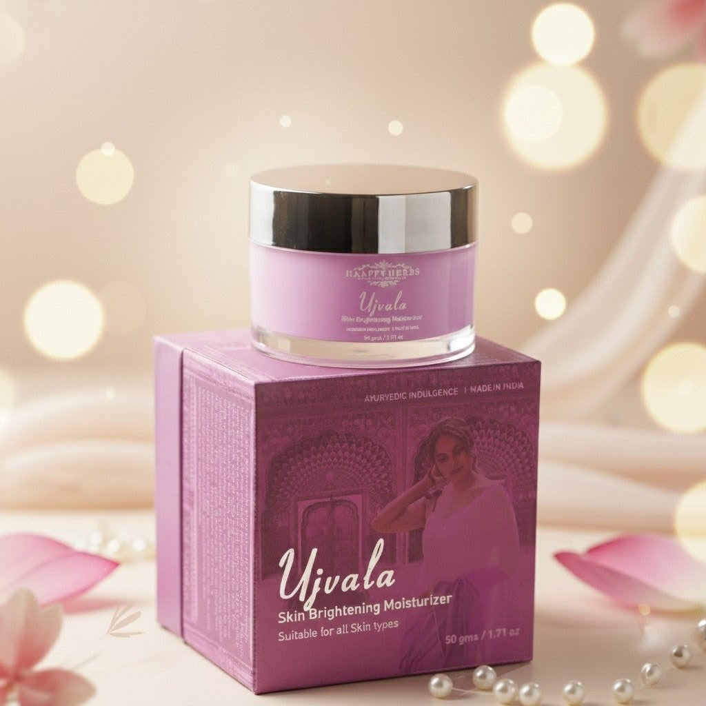 Ujvala Skin Brightening Moisturizer is a perfect Ayurvedic treatment to achieve youthful, naturally radiant skin. This rich formula is a precious blend of rich ingredients like vitamin E which reduces signs of aging and nourishes the skin,Best Ayurvedic Products for Skin. Jojoba being a rich antioxidant helps in the skin renewal process, the glycerin content in the moisturizer hydrates acting as a skin barrier protecting against skin irritants. The rose extracts having anti-aging properties promote youthful skin. Best Organic Face Cream, A soft-textured Cream, which gets absorbed easily into the skin, with regular usage shows visible improvements in skin luminosity, clarity, and smoothness.