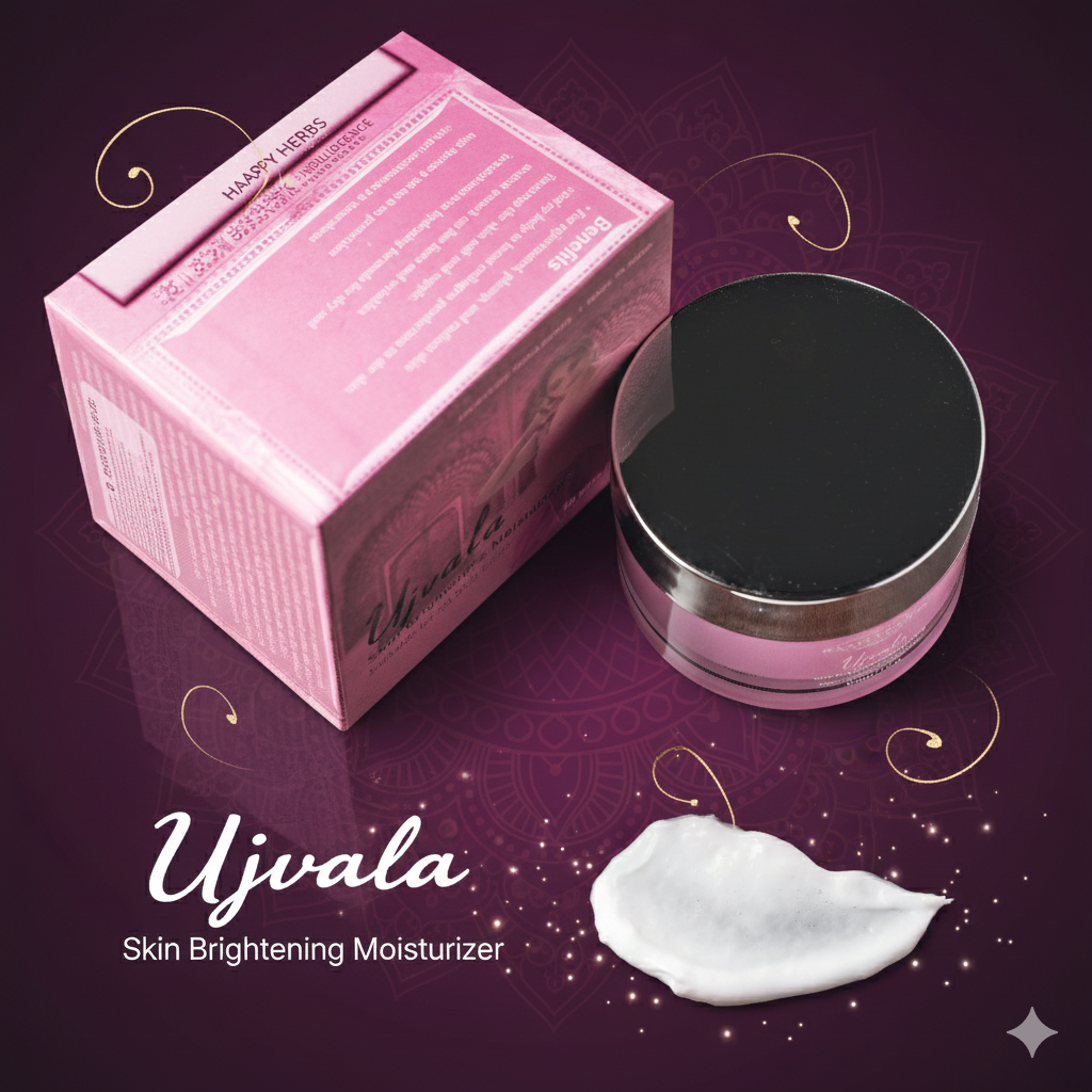Ujvala Skin Brightening Moisturizer is a perfect Ayurvedic treatment to achieve youthful, naturally radiant skin. This rich formula is a precious blend of rich ingredients like vitamin E which reduces signs of aging and nourishes the skin,Best Ayurvedic Products for Skin. Jojoba being a rich antioxidant helps in the skin renewal process, the glycerin content in the moisturizer hydrates acting as a skin barrier protecting against skin irritants. The rose extracts having anti-aging properties promote youthful skin. Best Organic Face Cream, A soft-textured Cream, which gets absorbed easily into the skin, with regular usage shows visible improvements in skin luminosity, clarity, and smoothness.